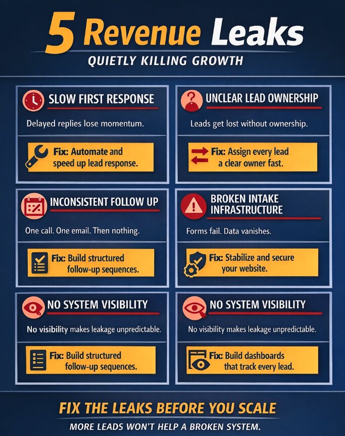 Revenue rarely collapses overnight. It erodes slowly through missed follow ups, unclear ownership, slow response times, and unstable infrastructure. The cost compounds quietly until scaling becomes expensive and unpredictable.