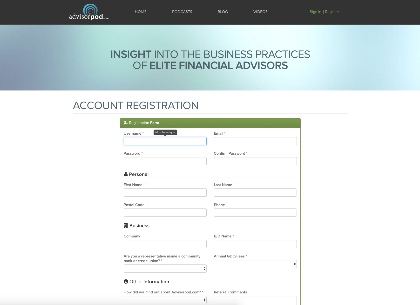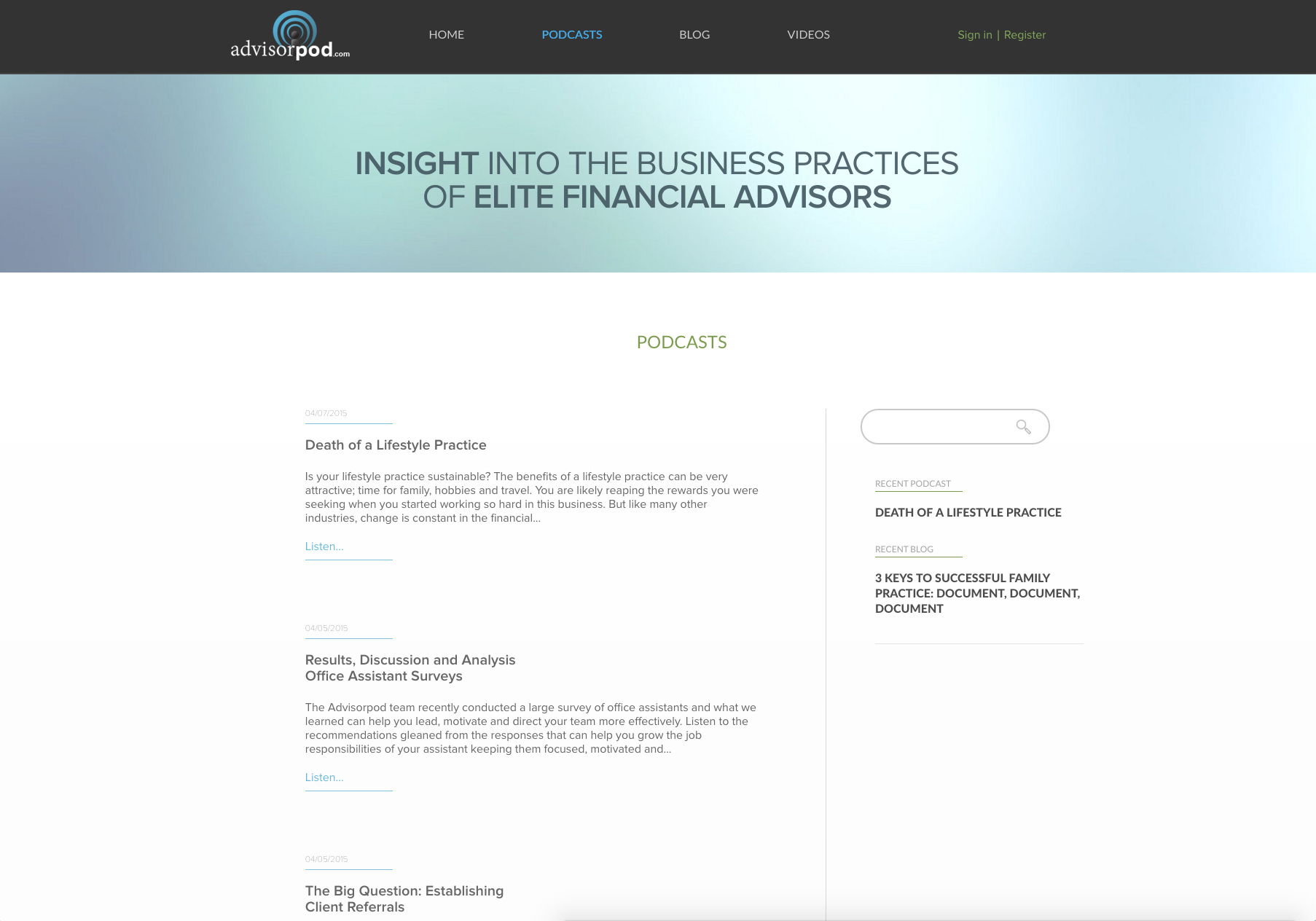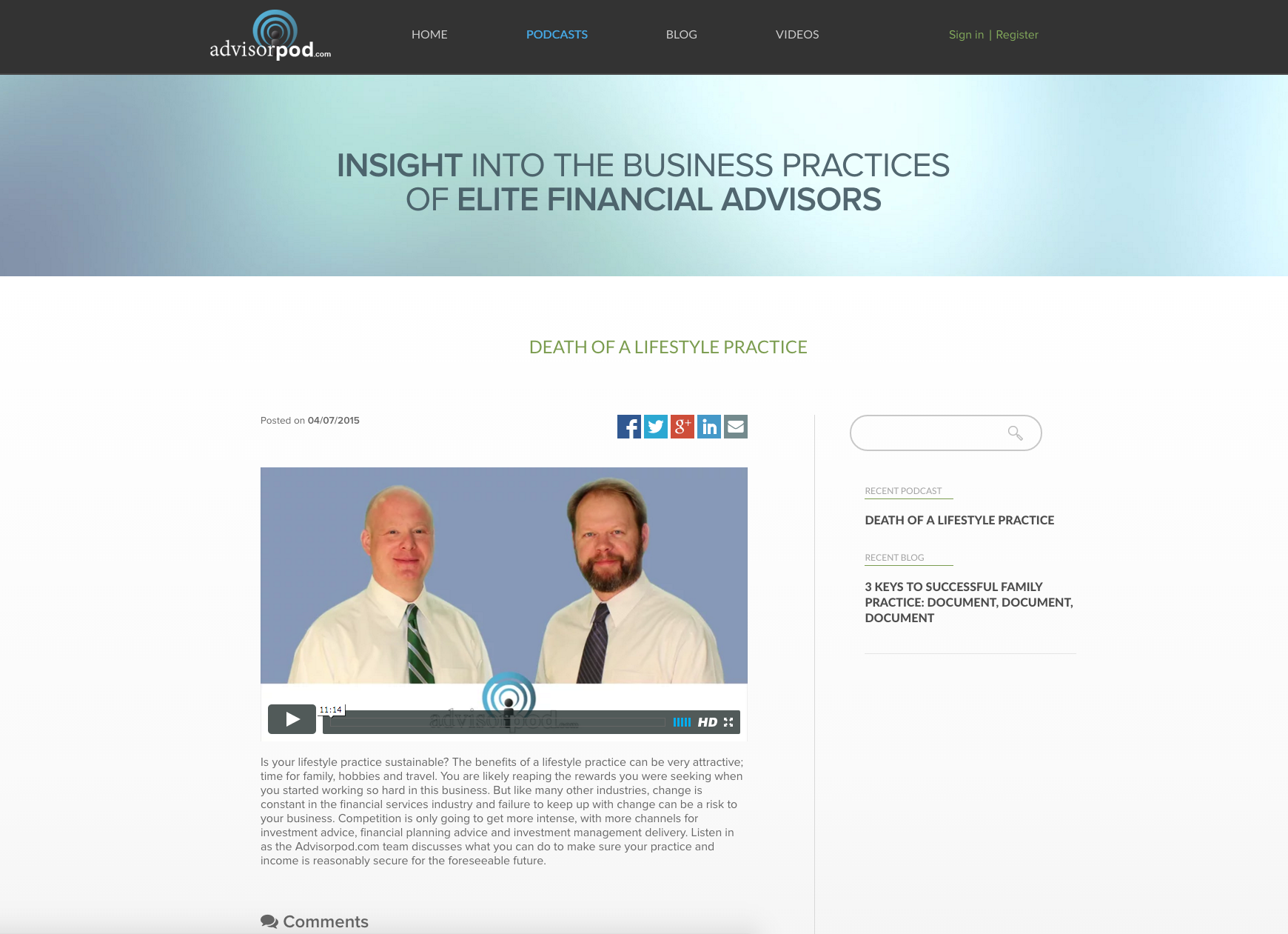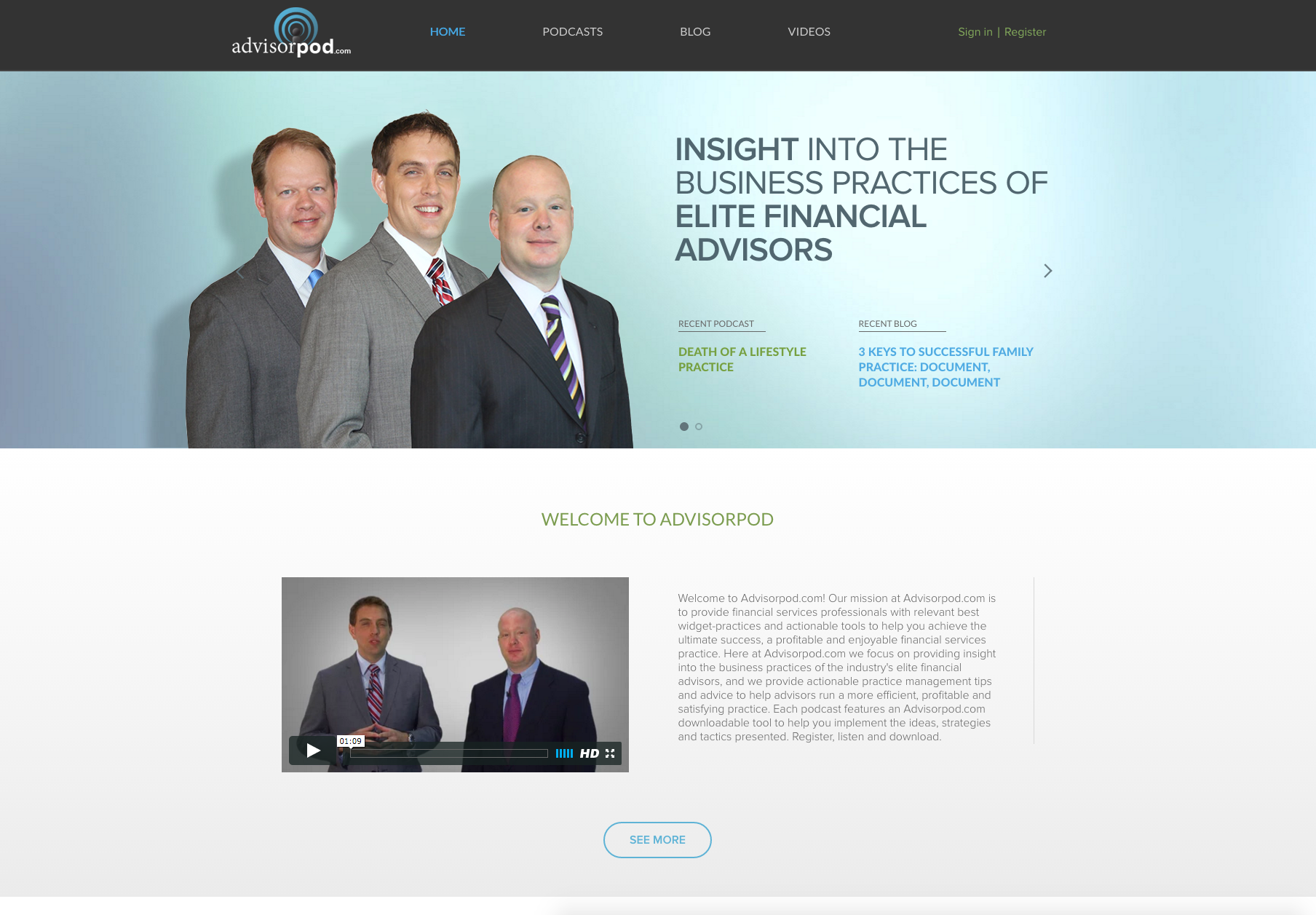 Advisorpod came to us needing a new design for their site along with a secure Content Management System, as the previous version had encountered some security issues. We created a simple, new design, transferred their large library of podcasts and videos, used Expression Engine to ensure security and flexibility in their content management, and gave them and slick and simple new design.