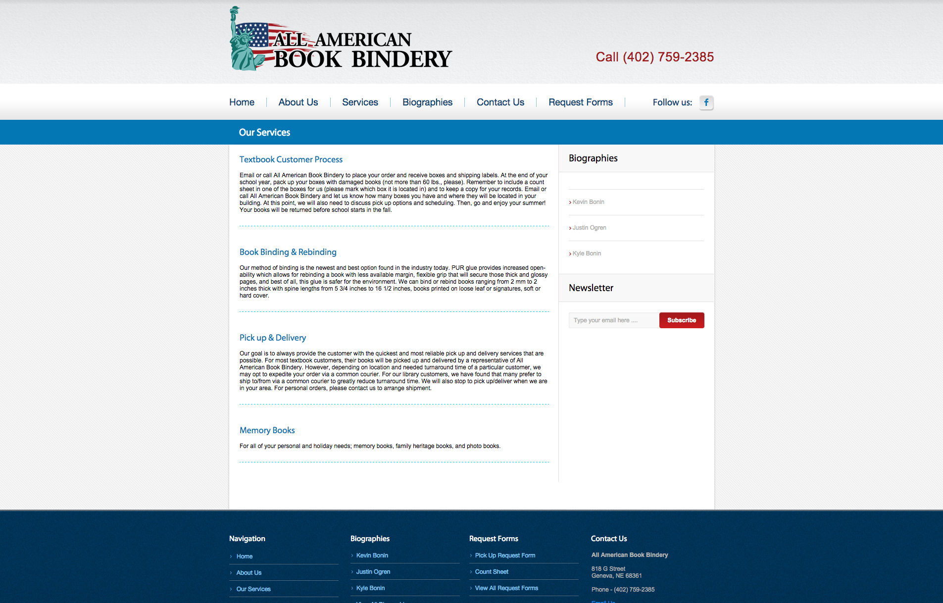 When All American Book Bindery showed up at our doorstep their need was simple, an online website brand to match their existing company's first class suite of products and services. Naturally We were happy to deliver a custom crafted All American Book Bindery website with a brand new enhanced logo, website brand, and powerful website management system.