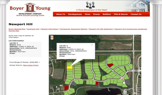We listened to Boyer Young's needs and quickly started laying the groundwork for an easy to use but very flexible property management system. The end result? A very powerful lot administration system that directly interacts with and overlays with Google Maps giving it's viewers the ability to not only interact with the development maps but could even see a street view of the lot they are interested in.