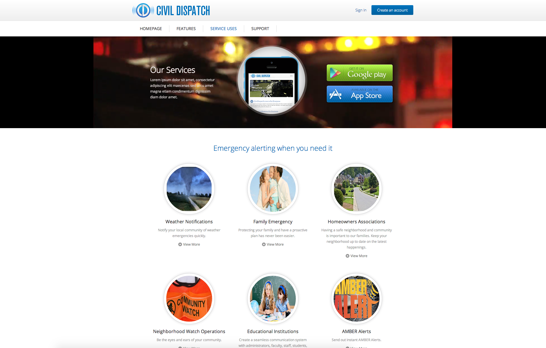 Where there was a need, we are there to provide the way. In this case the need was for a universal emergency dispatch system that anyone, anywhere could use to send notification campaigns to email, cell phones, landlines, websites, social networks, RSS feeds, and that could integrate easily and seamlessly into an unlimited array of other websites and notification networks. We delivered means to meet those needs in 2011 and were lucky enough to be considered to work on the rebrand for the new CivilDispatch.com website.