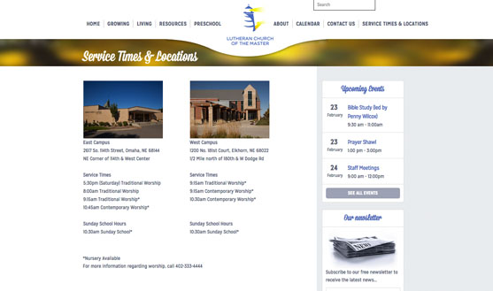 The congregation of Lutheran Church of the Master (LCM) was organized in 1959 with a Christ-centered mission reaching out to Southwest Omaha. While Omaha has changed greatly over the past 50 years, they've remained committed to confessing the life-giving Word of God. It's congregation has been a part of the American Lutheran Church (ALC), the Evangelical Lutheran Church in America (ELCA) and now a charter member congregation of Lutheran Congregations in Mission for Christ (LCMC).