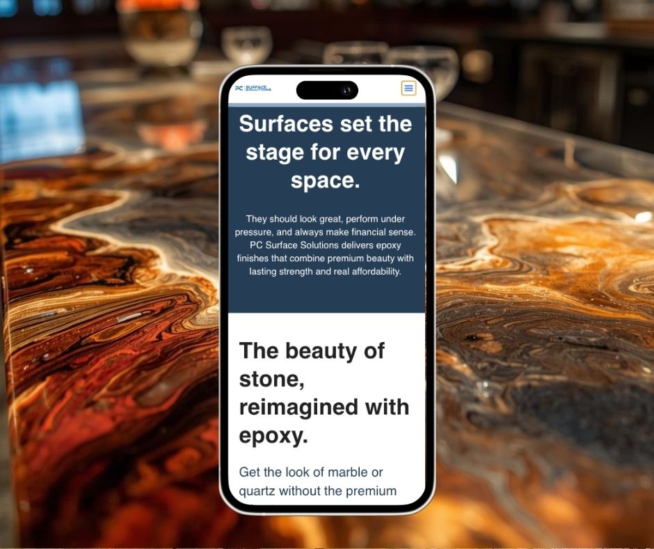 PC Surface Solutions now has a temporary website that reflects the strength, creativity, and affordability of their work. Navigation is seamless, visuals highlight the beauty of epoxy solutions, and customers can quickly request quotes or explore service options. There's even a newer site in the works which will position PC Surface Solutions as a leader in their market while giving them the digital foundation to scale.